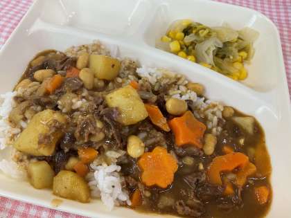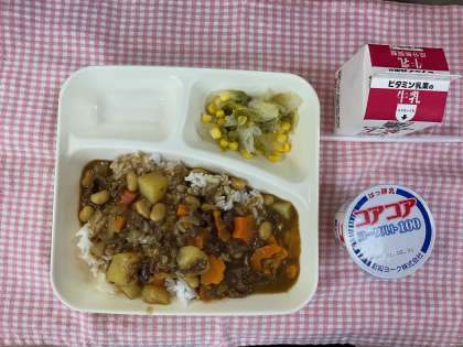 今日の給食は「牛肉と大豆のカレーライス、レタスとコーンのサラダ、ヨーグルト、牛乳」でした。普段、ちょっと苦手に思われがちな大豆がカレーライスに入っています。もちろんラッキーにんじんも♪豆が苦手な人も、カレー味でいつもよりは食べやすかったでしょうか。ヨーグルトはおいしく食べた後、容器を重ねてかさを減らして返却します。回収する時にも助かります。