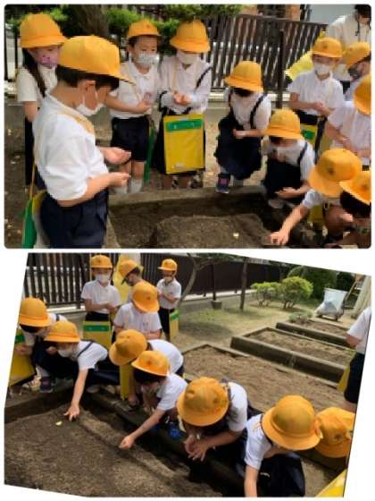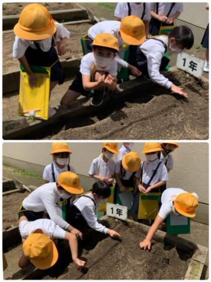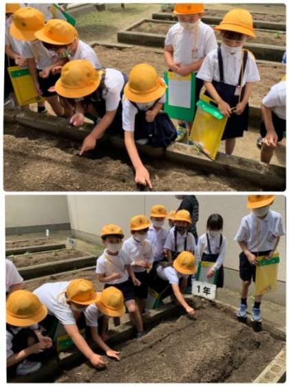 1年2組の生活の時間の様子です。学習園に「ひまわり」と「ラディッシュ」の種を植えています。「大きくな〜れ!!」