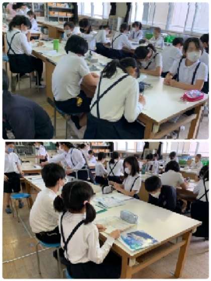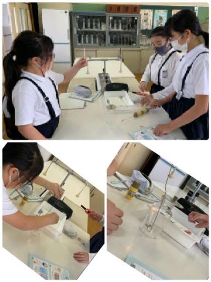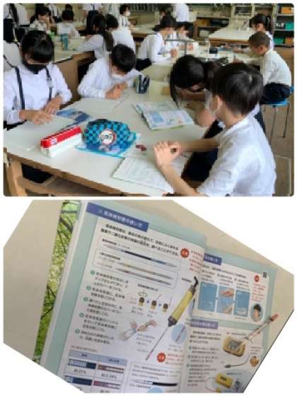 6年生の理科の授業の様子です。物を燃やした時の気体の変化について実験していました。気体検知管を使って、空気にふくまれる酸素や二酸化炭素の体積の割合を調べました。実験を終えた班から、ノートに実験結果をまとめています。実験の記録をしているノートは、色鉛筆も使いながら、とてもわかりやすくまとめられていました。