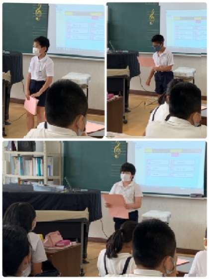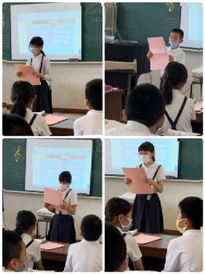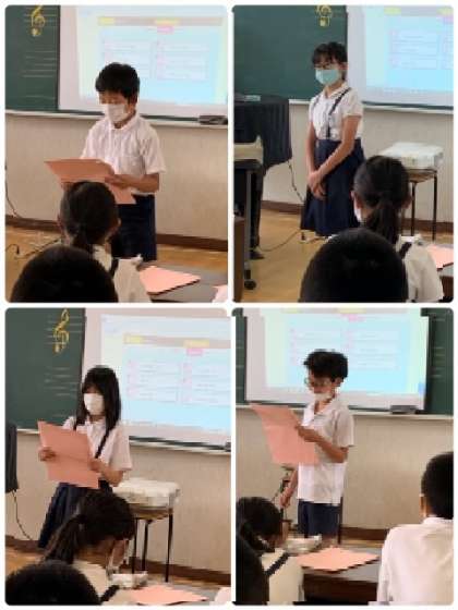 5年生 外国語 公開日 2021/05/26 更新日 2021/05/26 お知らせ 5年生の外国語の時間の様子です。今日は、自分が考えた「自己紹介」のスピーチをしていました。最初に「あいさつ」、そして「名前」「好きなもの」を紹介します。最後も「あいさつ」で終わります。 一人ずつ前に出て、少し緊張しながらスピーチしています。中には、覚えてきている児童もいました。 いいね(0)
