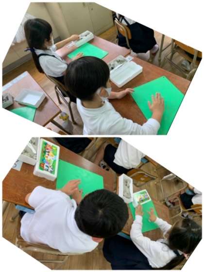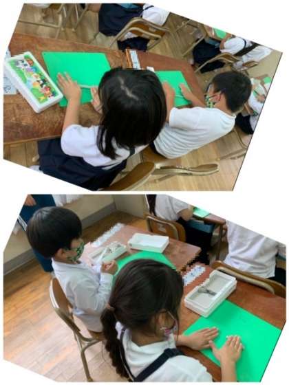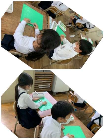 1年2組の図工の時間の様子です。「ひもひもねんど」に取り組んでいます。粘土を細長く伸ばして・・・・。