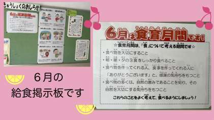 6月は食育月間です 公開日 2021/06/01 更新日 2021/06/01 お知らせ 6月に入りました。今月は「食育月間」です。玄関の掲示板の給食スペースにも食育月間についてのお知らせを掲示しています。おいしく食べること、食べ物や作ってくれる人、多くの恵みを与えてくれる自然を大切に思うこと。今月はいつもより少し「食」について考えてくれたらいいなと思います。 いいね(0)