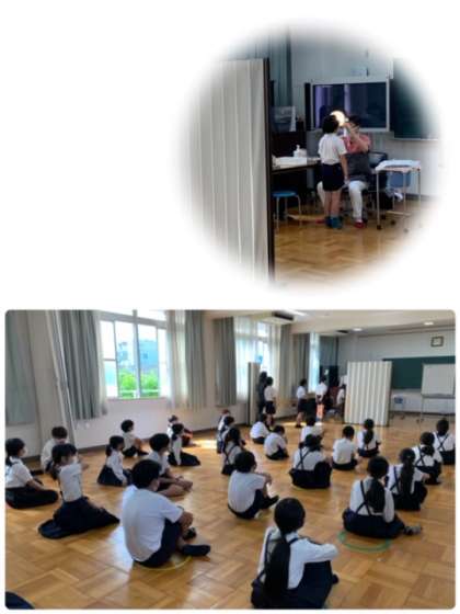 4〜6年生の歯科検診を実施しています。児童は、多目的室で距離をとって並んで待機しています。