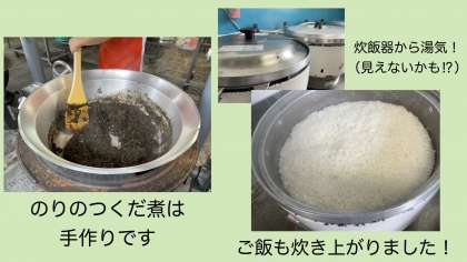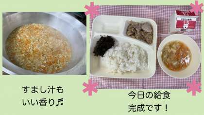 今日の給食2〜手作りつくだ煮〜 公開日 2021/06/03 更新日 2021/06/03 お知らせ そして、今日はご飯によく合うのりのつくだ煮がありました。きざみのりとしいたけを使い、だしを加えてしっかり混ぜ、味をつけています。すまし汁は、だしの風味がよく、薄味でもおいしい仕上がり。今日はご飯がすすむ献立でした。 いいね(0)