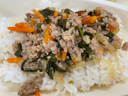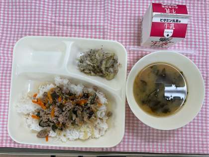 今日の給食は「豚ひき肉とにらのそぼろ丼、みそ汁、キャベツの赤じそあえ、牛乳」でした。そぼろ丼は、具がたっぷり!豚ひき肉のうま味に相性のよいにらが加わり、味も栄養もたっぷりのどんぶりになりました。暑くなってきたのでスタミナアップになりそうです。