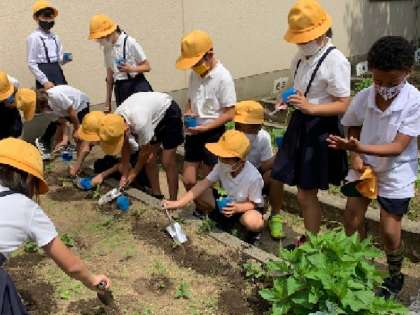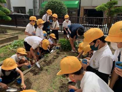 3年生が、学習園に「マリーゴールド」と「ほうせんか」の苗を植えました。今日までの間、種から成長するのを待っていました。