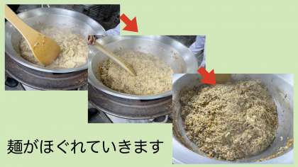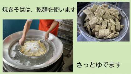 今日の給食は「黒糖ロールパン(1/2黒糖パン)、和風焼きそば、オクラの甘酢あえ、オレンジ、牛乳」でした。焼きそばの中華めんは乾めんです。ゆですぎると給食時間の頃にはめんが柔らかくなりすぎるので、さっとゆでてまだかたいままで野菜などと一緒に炒めます。乾めんの形が残っている状態から、どんどんほぐれていき、出来上がります。すると食べる頃にはちょうどいいのですが、ほぐれるように炒めて混ぜる調理員さんには大変な作業でした。