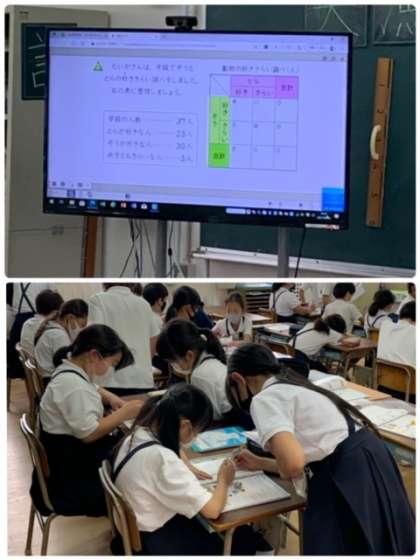 4年生 算数 公開日 2021/06/16 更新日 2021/06/16 お知らせ 4年生の算数の時間の様子です。問題「たいがさんは、学級でぞうととらの好ききらい調べをしました。右の表に整理しましょう。」に取り組んでいます。早く表を完成できた児童は、困っている友だちのところへ行って教えています。ミニ先生ですね。 いいね(0)