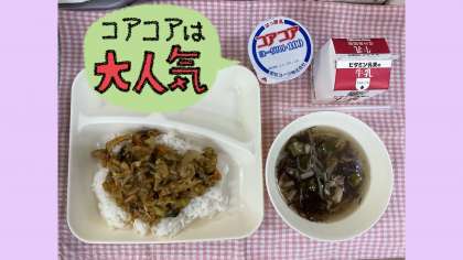 今日の給食〜つるつるとろり〜 公開日 2021/06/17 更新日 2021/06/17 お知らせ 今日の給食は「和風カレー丼、もずくとオクラのとろり汁、ヨーグルト、牛乳」でした。もずくとオクラはどちらもとろりとした食感。そしてもずくは、食べるとつるっとしたのどごしもよく、おいしい汁ものに仕上がっていました。和風カレー丼は暑い日にピッタリ!デザートはみんなに人気のヨーグルト、コアコアでした。このヨーグルト、学校の給食以外、あまり食べる機会がないようです・・・ いいね(0)