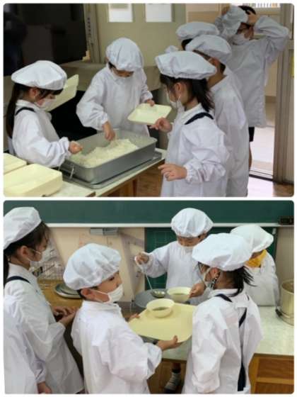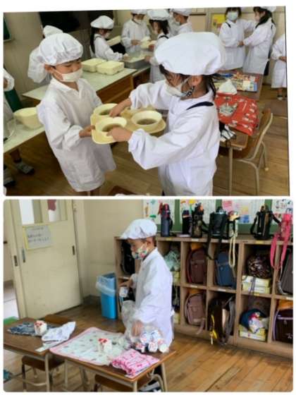 1年1組の給食の時間の様子です。給食当番のお仕事にも慣れたようで、とてもスムーズに役割をこなしていました。すばらしいですね!