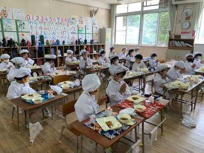 給食の用意が完了し、みんなで「いただきます」をしました。