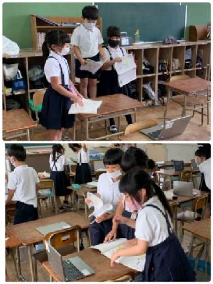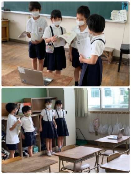 学習用端末の操作に慣れたところで、今日は、班に分かれて音読発表の様子を動画に撮りました。撮影した様子を見て、音読発表の練習に活かしていきます。