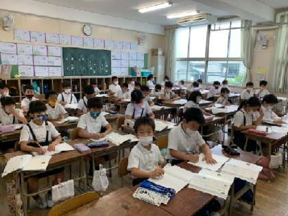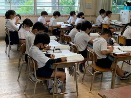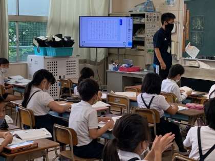 3年生の国語の時間の様子です。単元「調べて書こう、わたしのレポート」の学習をしています。今日の授業では、「レポート」の書き方について教えてもらっていました。