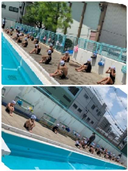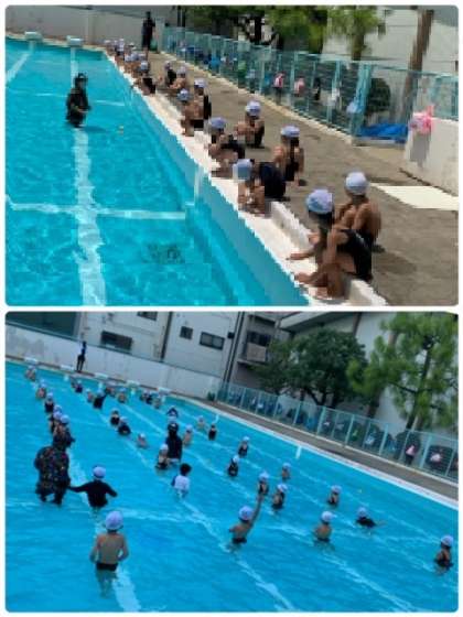 1年生とっては、小学校で初めて入るプールです。入る前からわくわくしているのが伝わってきます。事前に、プールでの動きなどを学習してきました。なので、初めてですが、スムーズに動くことができていました。1年生のみなさん、すばらしいです!!