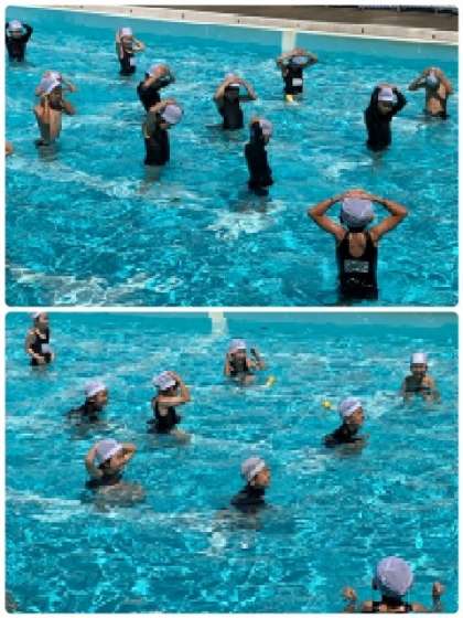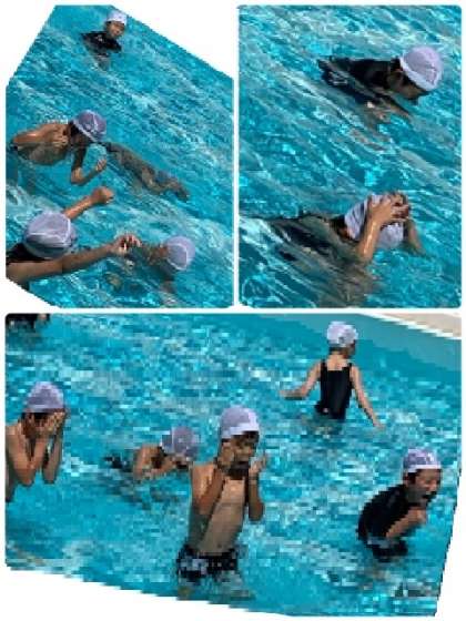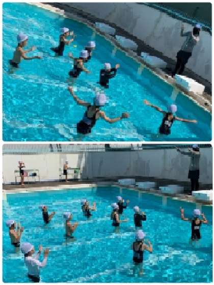先生の指示で、少しずつ体を水に沈めてみました。できる人は、頭まで水に入っています。