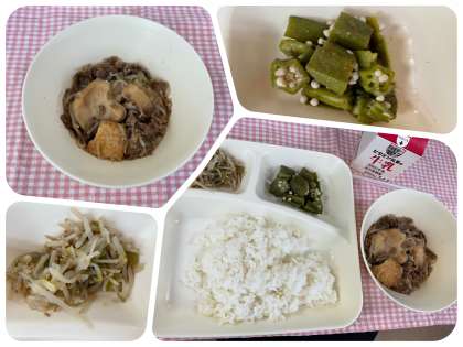 今日の給食〜大人気!すき焼き煮〜 公開日 2021/06/24 更新日 2021/06/24 お知らせ 今日の給食は「ごはん、すき焼き煮、オクラのかつお梅風味、もやしとピーマンのごまいため、牛乳」です。おなじみのすき焼きをイメージしたおかず「すき焼き煮」は、大好評!甘辛い味で、ご飯がどんどんすすみます。季節のオクラ、ごまの風味がよいごまいためと一緒においしくいただきました。 いいね(0)