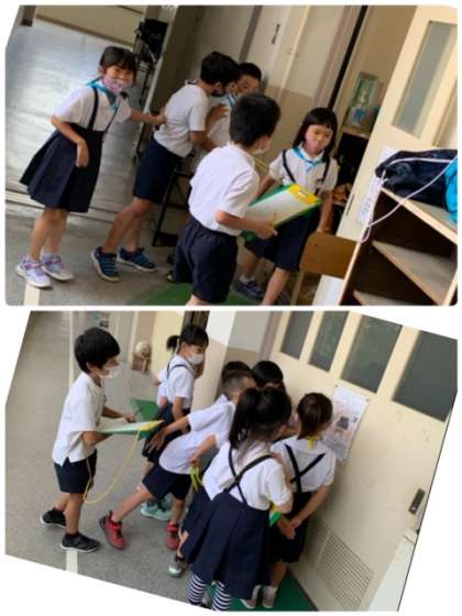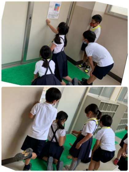 それぞれの教室前には、2年生が作成した「紹介カード」が貼ってあります。絵や文章で教室について紹介してくれています。教室前に到着したら、その「紹介カード」の前に集まり、代表が紹介してくれます。練習の成果が出ているようで、しっかりした声で紹介してくれていました。
