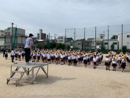 6月28日(月)週初めの朝、九条北小学校の児童たちは、元気に登校してきました。今日の児童朝会は運動場で行いました。児童朝会では、先週から始まった「水泳学習」について話をしました。