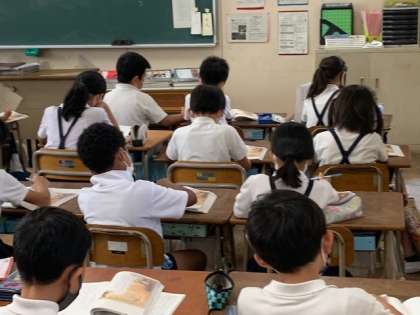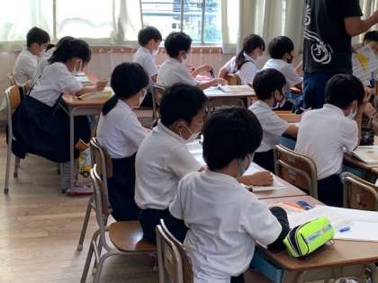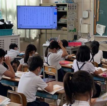 3年生の国語の時間の様子です。単元「はりねずみと金貨」の学習をしています。物語を読んで、あらすじをまとめていきます。先生からは、どのような手順であらすじをまとめていったらよいのか教えてもらっています。