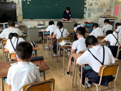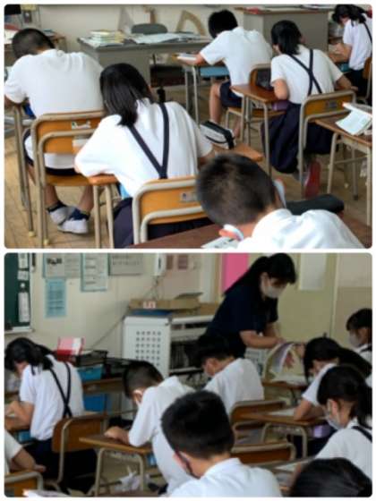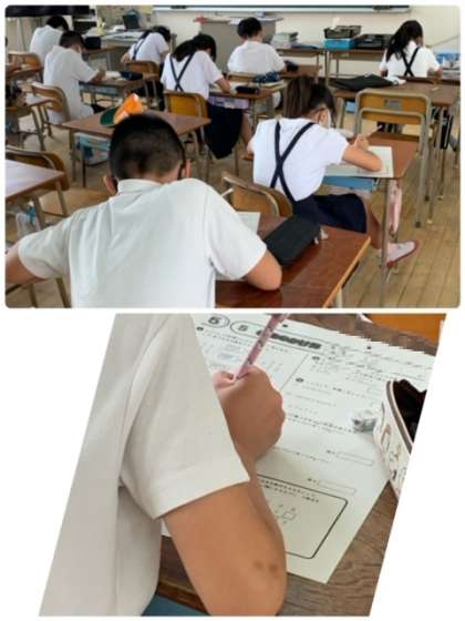 5年1組の算数の時間の様子です。単元テスト「小数のかけ算」に取り組んでいます。結果を楽しみにしています。