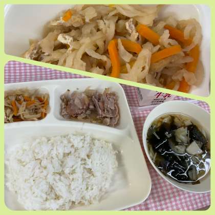 今日の給食は「ごはん、豚肉の甘辛焼き、すまし汁、切干しだいこんのいため煮、牛乳」でした。普段食べる回数が減ってきたかもしれない乾物「切干しだいこん」の登場です。ぬるま湯でもどし、にんじんやうすあげといため煮にしています。よく味がしみておいしく仕上がっていました。生のだいこんを干すことでうま味が増し、カルシウムや鉄、食物繊維なども多くなります。