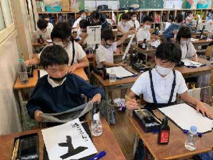 3年生の書写の時間です。今日は、「下」という字を練習しています。お手本を見ながら、集中して書いています。