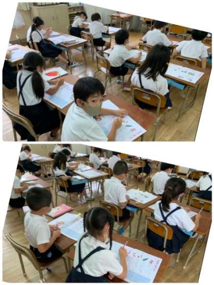1年2組の国語の時間の様子です。「ひらがな」の練習をしています。今日のひらがなは、「きっぷ」や「でんしゃ」など、小さく書く字が入っている言葉です。集中して、1つ1つていねいに練習しています。