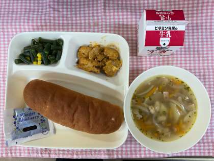 今日の給食は「コッペパン、鶏肉のカレーマヨネーズ焼き、てぼ豆のスープ、さんどまめとコーンのサラダ、ブルーベリージャム、牛乳」でした。今日は「まめ」がつく食材が2つ。てぼ豆とさんどまめです。1年生の教室で献立の話をしていると、「さんどまめってどれ?」「これだよ。」「あっ、さんどまめあったよ!」と聞こえたのでふり返ると、おわんの中のてぼ豆を指さして・・・。この白いのはてぼ豆、サラダに入っているのがさんどまめだよ、と声かけ。「えっ、そうなんだ〜。」と少し驚いた様子でしたが、パクッと食べて「おいしいね!」