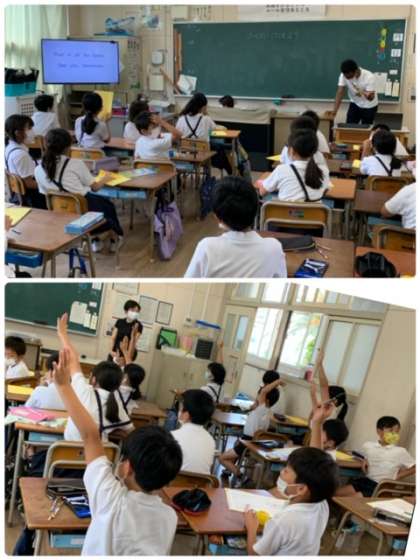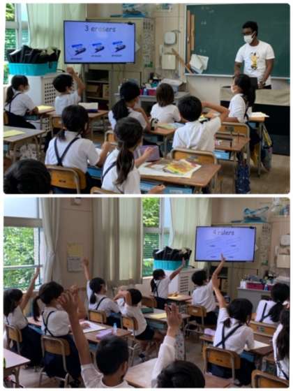 3年生の外国語の時間の様子です。3年生も、「クイズにこたえよう」に取り組んでいました。ただし、3年生の使う数は、10までの数です。電子黒板に映し出されたイラストの数を、英語で答えています。