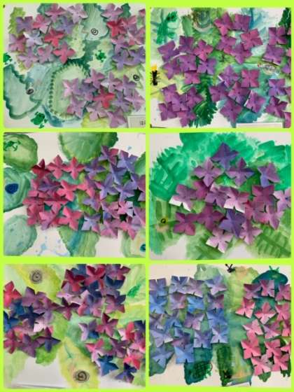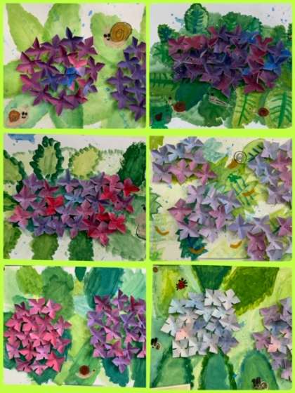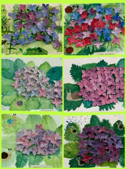 4年生 図工作品 公開日 2021/07/01 更新日 2021/07/01 お知らせ 九条北小学校の中庭に咲く「紫陽花」の季節は終わりを迎えたようですが、4年生の教室には、みごとな「紫陽花」の花が咲いています。 図工の時間に、水彩絵の具と折り紙を使って作製しました。花の位置や葉の位置、葉の色どりなど、それぞれが工夫をこらして完成させてくれました。 いいね(0)