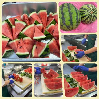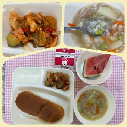 今日の給食〜すいかの日〜 公開日 2021/07/02 更新日 2021/07/02 お知らせ 今日の給食は「おさつパン、鶏肉と夏野菜のソテー、押麦のスープ、すいか、牛乳」でした。給食ではすいかは1年に1回出ます。1年に1回と聞くと子どもたちは大騒ぎ。1玉を64切れにすると話すと、さらに大騒ぎ!夏野菜の赤ピーマンやなす等が入ったソテーもあり、今日は夏の献立でした。 いいね(0)