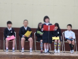 3月24日火曜日、8時50分より修了式を行いました。初めに学年の代表児童に修了証(通知表)を渡しました。次に校長先生のお話、続いて、生活指導担当の先生から春休みについてのお話、最後に、各学級の代表児童から、この一年頑張ったことや嬉しかったことなどの発表がありました。1年生から5年生の児童は、立派に式を終えました。