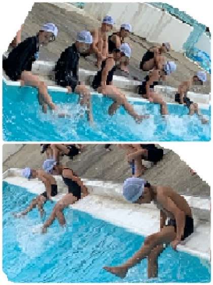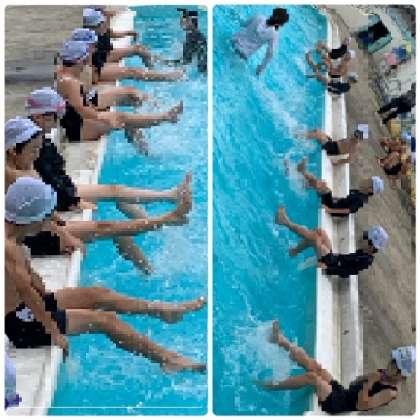 2年生の水泳学習も、引き続き、インストラクターの方に指導していただきました。プールサイドに座った状態で、ばた足の練習をしています。