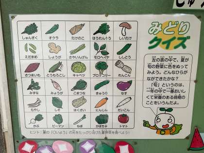 給食の掲示板にみどりクイズをはりました。夏が旬の野菜はこの中のどれでしょう。そして選んだ野菜のところに色を塗ると、言葉が一文字出来上がります。掲示板には色は塗れないので、色のついたカードをはっていこうと思います。