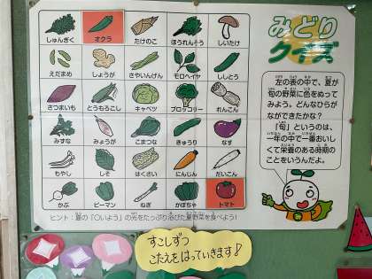 夏が旬の野菜はどれでしょう2〜給食の掲示板より〜 公開日 2021/07/09 更新日 2021/07/09 お知らせ 昨日もお知らせした給食の掲示板にある「みどりクイズ」。夏が旬の野菜はどれでしょうの続きです。今日はまず2つ正解をはり出しました。「オクラ」と「トマト」です。どうでしょう。正解でしたか?まだまだ来週に続きます。 いいね(0)