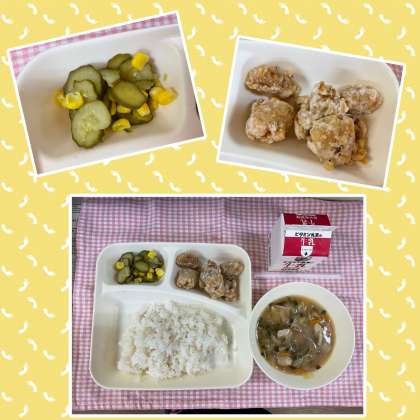 今日の給食は「ごはん、鶏肉のからあげ、中華みそスープ、きゅうりとコーンの甘酢あえ、牛乳」でした。鶏肉のからあげは、みんなに大人気。当番が配っていくと、後には小さなかけらが残ります。ですが、そのかけらもみんなに大人気でした(^-^)