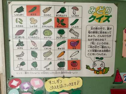 夏が旬の野菜はどれでしょう3〜給食の掲示板より〜 公開日 2021/07/12 更新日 2021/07/12 お知らせ 夏が旬の野菜をさがしていく「みどりクイズ」。今日も少し正解をはり出しました。「なす」と「モロヘイヤ」です。どんな文字が見えてくるでしょうか。まだまだあります。 いいね(0)