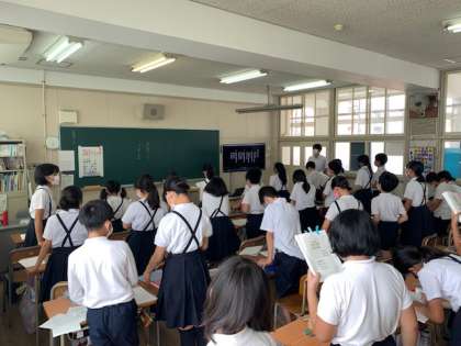 6年生の総合の時間です。林間学習に向けて、準備を進めています。今日は、「カレーライス」の作り方や「キャンプファイアーの歌」の練習をしていました。みんなで、林間学習を盛り上げましょう!!