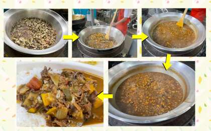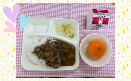 今日の給食は「夏野菜のカレーライス、キャベツのサラダ、みかん(冷凍)、牛乳」でした。今日のカレーライスには、かぼちゃ、たまねぎ、なす、トマト(缶)、ピーマン、セロリが入っていました。本当に野菜たっぷりです。はじめはなすなどがとても目立っていましたが、煮込むとどんどん美味しそうに!低学年もルウのおかわりをたくさんの人がしてくれました。