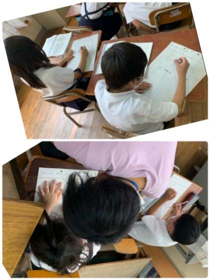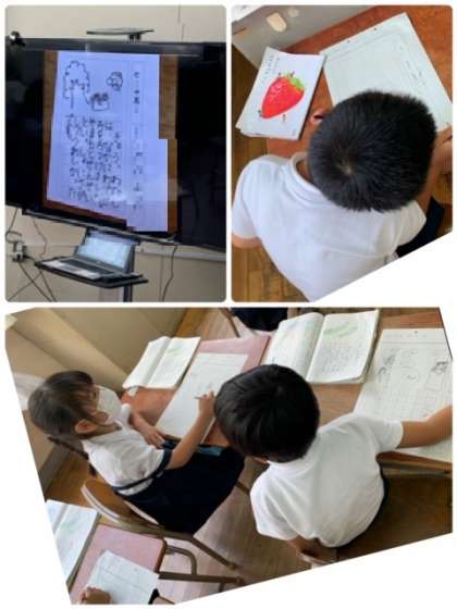 1年2組の教室の様子です。絵日記を書いています。みんなが描いた絵を見せてくれました。見せてくれた絵からは、一生懸命描いたことが伝わってきます。