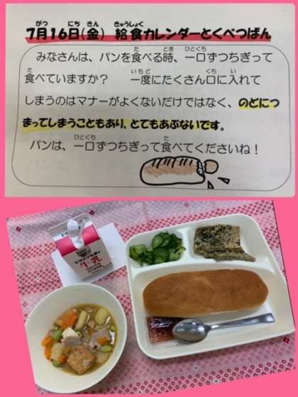 (小学校の学校給食において、5年生に在籍する児童がパンを喉に詰まらせて窒息する事故がニュースになっていました。注意喚起の「給食カレンダー特別版」を、各学級に配布しています。また、委員会児童も放送で呼びかけました。)