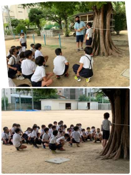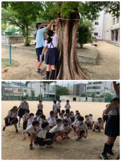 3年生が運動場のメタセコイヤの所に集まってきました。算数の学習で、単元「長い長さを表そう」の学習をしています。今日は、問題「学校にある、まるいもののまわりの長さをはかってみましょう。」に取り組んでいます。教室で「メタセコイヤの幹のまわりの長さは、どれくらいか」予想をたてて、運動場に出てきました。