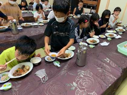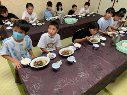 夕食が始まりました。牛肉が美味しい〜と声が出ています。