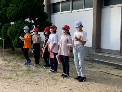 今日から6年生の林間学習が始まります。全員そろって、出発式をしています?