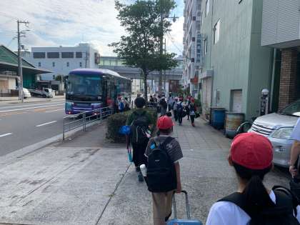 バスに乗車します。早朝より、たくさんの保護者の皆様に送っていただきました。ありがとうございます。