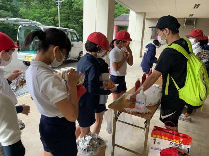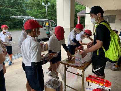 班ごとに、お皿にのせて、ケチャップをかけて…。バナナとジュースをもらっています。