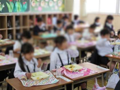4月9日木曜日、今日から給食が始まりました。メニューは、カツカレーライスとフルーツ、ミニフィッシュでした。給食室では、しっかり「ありがとうございます」「いただきます」を言うことができました。
