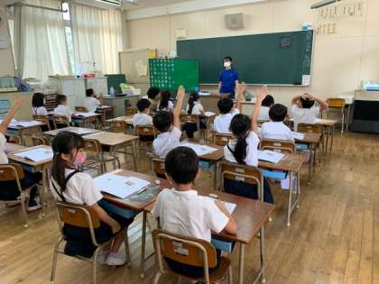 1年2組の国語の時間の様子です。みんなの元気なあいさつで、始まりました。最初は「漢字練習帳」に取り組みます。今日の漢字「四(よん・し)」に使われている部分の形について発表していました。