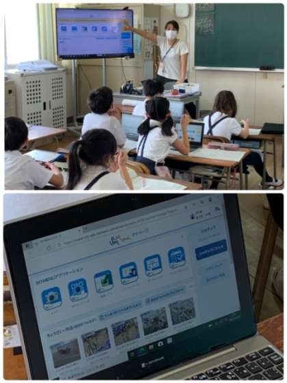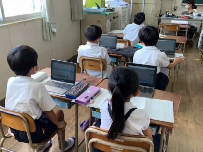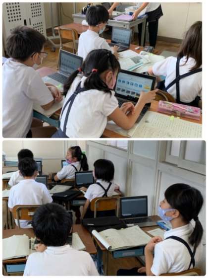 2年生の国語の時間の様子です。夏休みの宿題のプリントの解説をしています。電子黒板と合わせて、使い方の練習も兼ねて各自の学習用端末にも解答を配布しています。電子黒板で見えにくいときには、手元でも確認できますね。