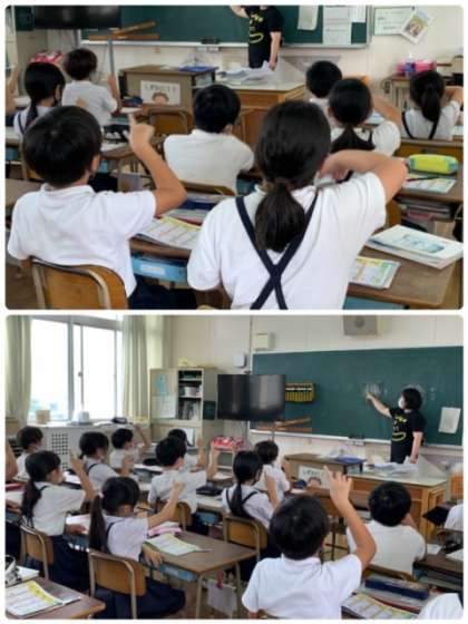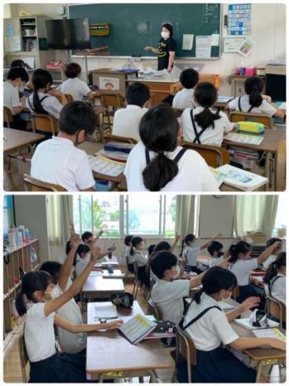 4年生の国語の時間の様子です。授業の初めに漢字の練習をしています。今日の漢字は、「給(きゅう)」と「機(き)」です。先生から書く時の注意点を教えてもらってから、みんなで書き順を確認しました。